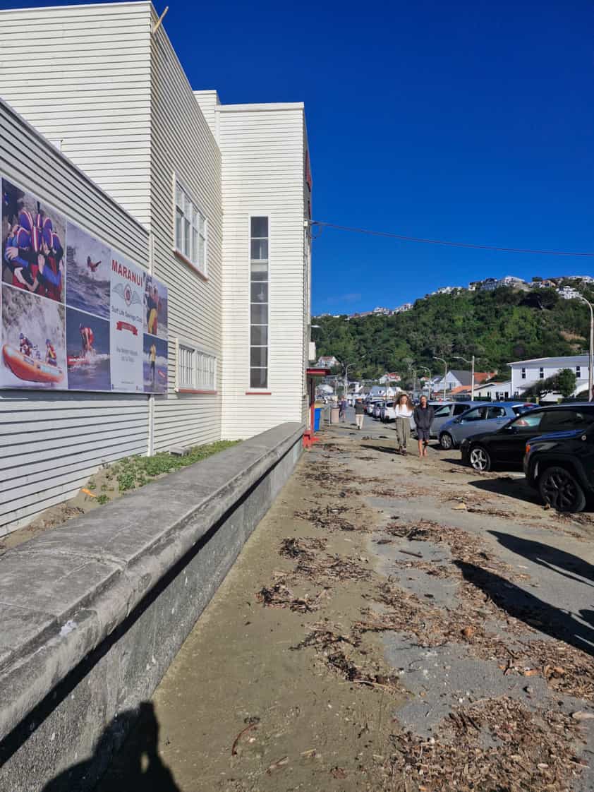 After the StormThe club took a battering in the Southerly storm and associated high tides at the beginning of May. The boatshed filled with water and sand, and the tide came up through the drains to the clubrooms, luckily with no lasting damage. Rhys set to with a pump to remove the water from the shed, the council dug out our doors and when the time is right we will be looking for volunteers to help remove all the sand. Here are some pics of the aftermath.  |
